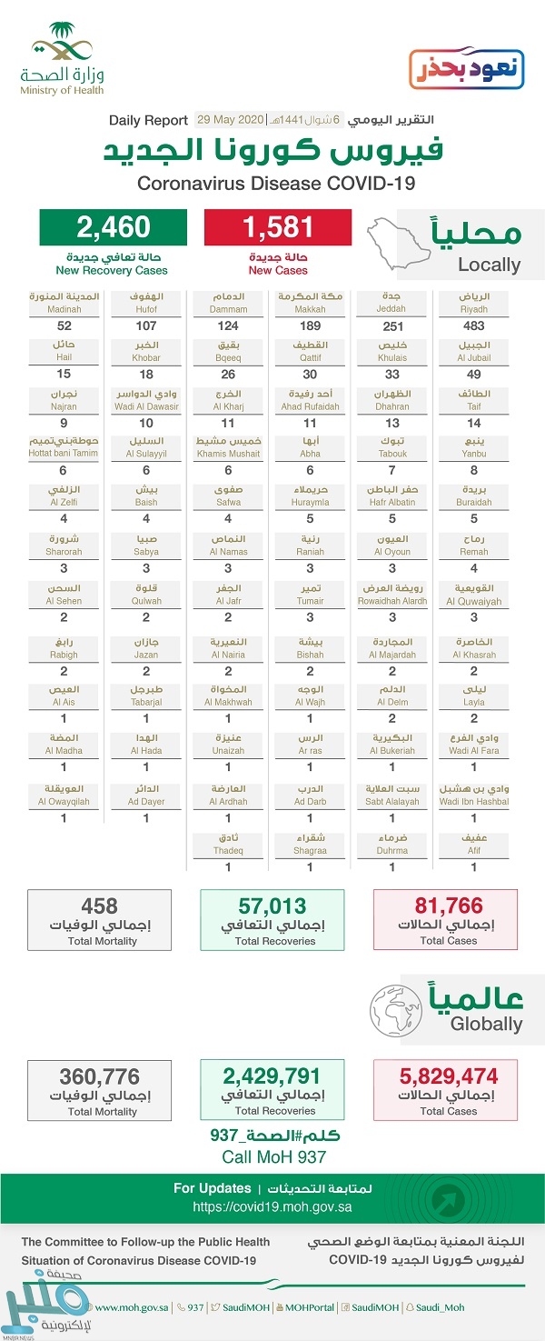 وأضافت الوزارة في بيان لها، أن إجمالي إصابات فيروس كورونا في المملكة ارتفعت إلى 81766 حالة، لافتة إلى تسجيل 17 حالة وفاة جديدة ليصل مجموع الوفيات في المملكة إلى 458 حالة.