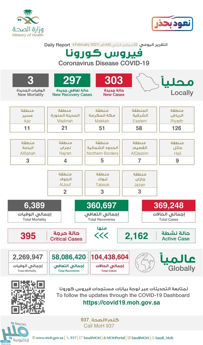 أعلنت وزارة الصحة، اليوم الخميس ، عن تسجيل 303 إصابة جديدة بفيروس “كورونا”، و 3 حالات وفاة ، و 297 حالة تعافي .