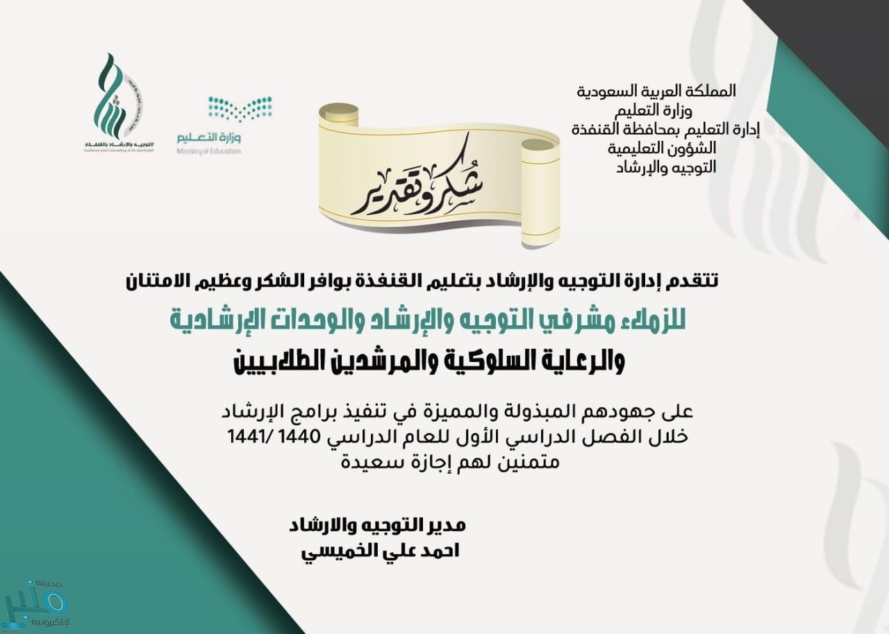 قدَّم الأستاذ أحمد بن علي الخميسي مدير التوجيه والإرشاد في إدارة تعليم القنفذة خالص شكره وتقديره لزملائه المشرفين في قسم التوجيه والإرشاد والمرشدين الطلابيين، مؤكدًا أن ذلك تقديرًا منه للجهود الكبيرة التي قدموها طيلة الفصل الدراسي الأول، وأثمرت العديد من البرامج الهادفة.