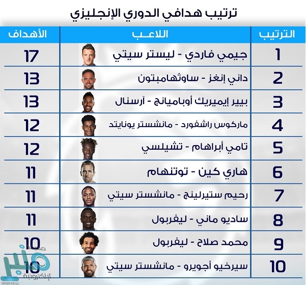 وفيما يلي جدول ترتيب هدافي الدوري الإنجليزي كاملًا:
