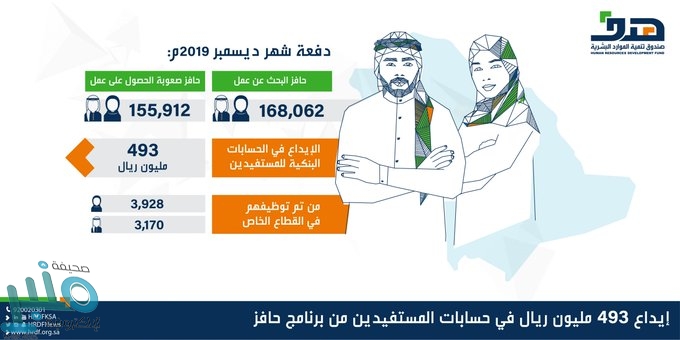 أودع صندوق تنمية الموارد البشرية (هدف)، اليوم (الأحد)، أكثر من 493 مليون ريال، في الحسابات البنكية لأكثر من 323 ألف مستفيد ومستفيدة من المسجلين في برنامجي حافز البحث عن عمل وحافز صعوبة الحصول على عمل، وذلك عن شهر ديسمبر 2019م.