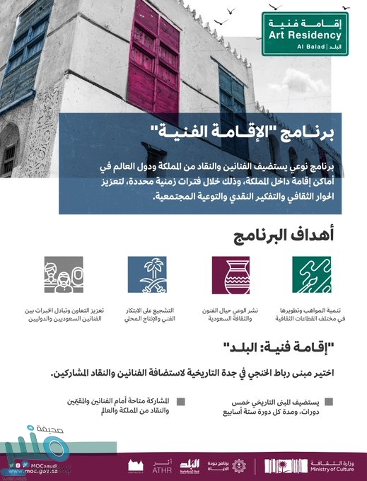 وتأتي انطلاقة البرنامج بعنوان “إقامة فنية: البلد”، حيث ستستضيف منطقة البلد في جدة التاريخية دورات البرنامج –مدة كل دورة ستة أسابيع- سيتم التركيز فيها على التوعية الاجتماعية والتطوير المهني والتفكير النقدي، وستكون المشاركة فيها متاحة أمام الفنانين ومقيمي الأعمال الفنية والنقاد السعوديين والدوليين.