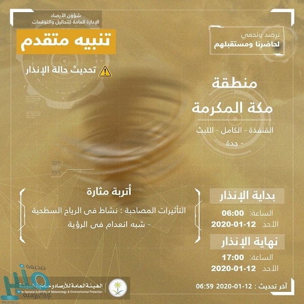 نبّهت الهيئة العامة للأرصاد وحماية البيئة، ممثلة في الإدارة العامة للتحاليل والتوقعات في تقريرٍ لها اليوم, من نشاط للرياح السطحية قد يؤدي إلى تدني في مدى الرؤية على محافظات جدة والقنفذة والليث والكامل.