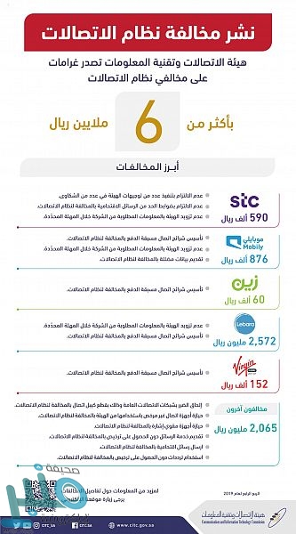 أصدرت هيئة الاتصالات وتقنية المعلومات غرامات مالية تجاوزت (6) ملايين ريال ضد عدد من مقدمي الخدمة المخالفين لنظام الاتصالات، من بينهم شركة الاتصالات السعودية “STC”، وشركة اتحاد اتصالات “موبايلي”، وشركة الاتصالات المتنقلة السعودية “زين”، وشركة اتحاد جوراء للاتصالات وتقنية المعلومات “ليبارا موبايل”، وشركة اتحاد “فيرجن موبايل”، إضافة إلى مخالفين آخرين؛ بسبب ارتكابهم عدة مخالفات لنظام الاتصالات, وذلك وفقاً للقرارات الصادرة عن لجنة النظر في مخالفات نظام الاتصالات.