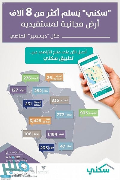 واصل برنامج “سكني” التابع لوزارة الإسكان تسليم الأراضي السكنية المجانية للمستفيدين من البرنامج ممن تم التخصيص لهم في الدفعات الشهرية الماضية، حيث تم خلال شهر ديسمبر الماضي تسليم 8,452 قطعة أرض توزعت في مختلف مناطق المملكة، وذلك تمهيداً لبدء بنائها، إذ ساهم في تحقيق هذا الرقم سهولة الاجراءات من خلال منصة سكني الالكترونية التي تضم تطبيقاً وموقعاً إلكترونياً، يمكن المستفيد من تنفيذ كافة الاجراءات المتعلقة بتسليم الأراضي المجانية إلكترونياً بدءاً من التقديم حتى توقيع العقد.