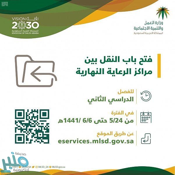 وتدعو الوزارة جميع المستفيدين المسجلين في خدمات مراكز الرعاية النهارية، والراغبين في النقل ما بين المراكز، إلى الدخول إلى الخدمات الإلكترونية في موقع الوزارة، حيث ستكون الخدمة متاحة إلكترونيًا فقط على الرابط التالي: eservices.mlsd.gov.sa .