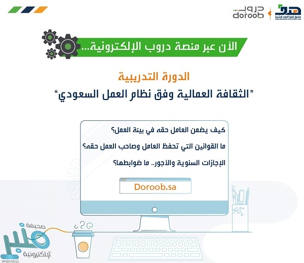 يقدم صندوق تنمية الموارد البشرية (هدف)، ممثلاً في برنامج التدريب الإلكتروني (دروب) دورة تدريبية بعنوان: (الثقافة العمالية وفق نظام العمل السعودي)، وذلك بهدف تعريف الموظفين والباحثين عن عمل بنظام ولوائح العمل السعودي، والتوعية والتثقيف بالحقوق والواجبات المترتبة على أطراف العلاقة التعاقدية، وتغطي الدروة التدريبية ثلاث محاور رئيسية هي: حقوق العامل، وواجبات العامل اتجاه عمله، والصحة والسلامة في بيئة العمل.