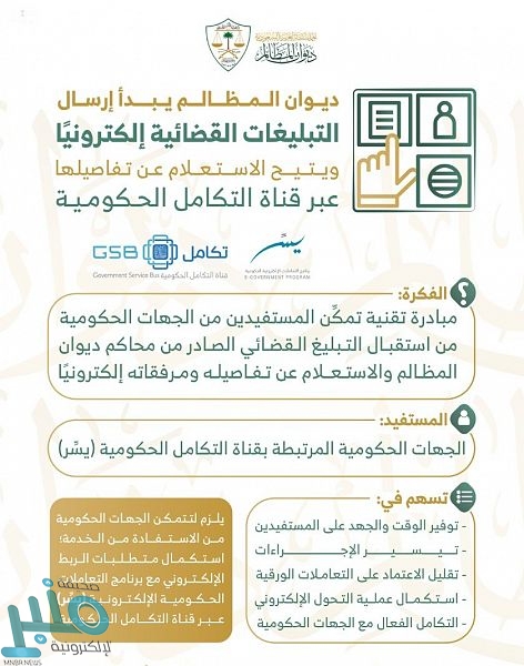 ويرتبط ديوان المظالم بقناة التكامل الحكومية المزود للخدمات الإلكترونية، التي تُعد منصة تكاملية لتبادل البيانات والمعلومات بين الجهات الحكومية، حيث يتم إرسال التبليغات القضائية إلى الجهات الحكومية المستفيدة مشتملة على البيانات المعتمدة في التبليغ.