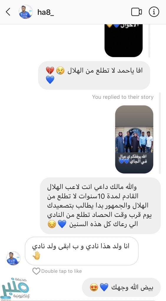 وأظهرت محادثة للاعب مع مشجع هلالي عبر صفحته على موقع انستغرام أنه سيبقى في الهلال كونه أحد أبناء النادي.