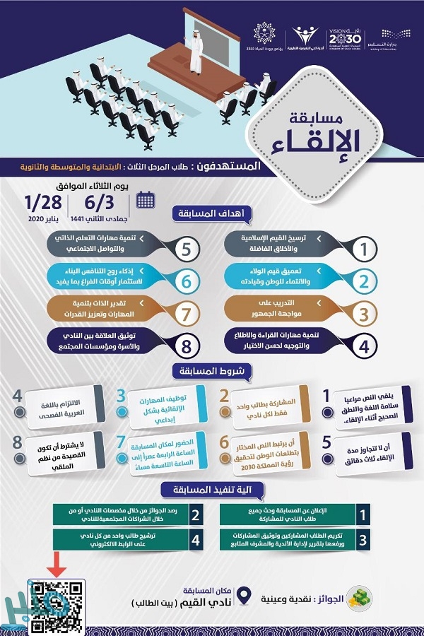 من جهته بين مشرف النشاط الثقافي في تعليم الرياض المشرف على المسابقة الأستاذ عبدالله الفارس أن شروط المسابقة التي يجب أن يلتزم فيها النادي هي ترشيح طالب واحد من كل نادي وأن يلتزم الطالب خلال إلقائه باللغة العربية الفصحى وأن يلقي الطالب مراعياً سلامة اللغة والنطق الصحيح أثناء الإلقاء وأن يوظف المهارات الإلقائية بشكل إبداعي وأن لا تتجاوز مدة الإلقاء ثلاث دقائق ، وأن يرتبط النص المختار بتطلعات الوطن بتحقيق رؤية المملكة 2030 ، ولايشترط أن يكون النص في حال كونه قصيدة أن تكون من نظم الملقي .