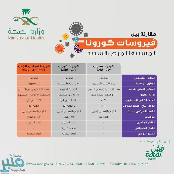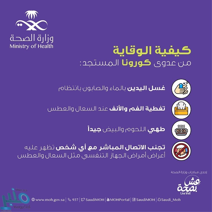 كثفت وزارة الصحة جهودها التوعوية للتعامل مع فيروس كورونا المستجد، ونشرت عبر حسابها على موقع التواصل الاجتماعي تويتر إنفوجرافيك توعوي عن كيفية الوقاية من عدوى كورونا المستجد، أكدت من خلاله على أهمية التقيد بالاحتياطات الوقائية للالتهابات التنفسية عامة والتي تشمل المداومة على غسل اليدين بالماء والصابون بانتظام، وتغطية الفم والأنف عند السعال والعطس.