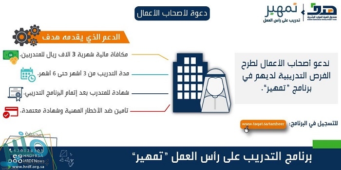 إلى ذلك جدد “هدف” دعوته للخريجين والخريجات للاستفادة من الفرص التدريبية لبرنامج “تمهير”، واكتساب الخبرات والمهارات اللازمة المطلوبة لسوق العمل من خلال التدريب العملي في مواقع العمل الفعلية وفقًا لتخصصاتهم.