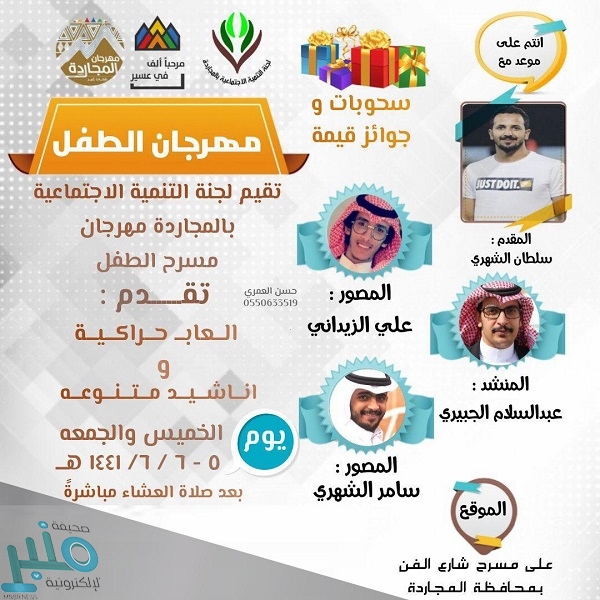 تعلن اللجنة الفرعية للتنمية السياحية بمحافظة المجاردة بالتعاون مع لجنة التنمية الاجتماعية وضمن فعاليات مهرجان المجاردة “شتانا غير” عن إقامة مهرجان مسرح الطفل يومي الخميس والجمعة ٥-١٤٤١/٦/٦ ، وذلك بمسرح شارع الفن بعد صلاة المغرب مباشرة وسيتم السحب على العديد من الجوائز.