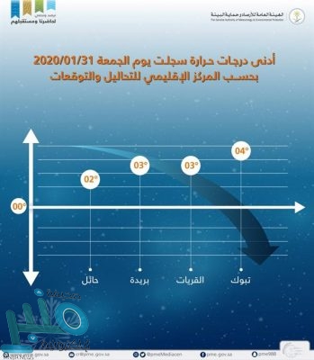 وقالت الهيئة إن أدنى درجة حرارة سجلت اليوم كانت درجتين مئويتين في حائل، و3 درجات في كل من القريات وبريدة، و4 درجات في تبوك.