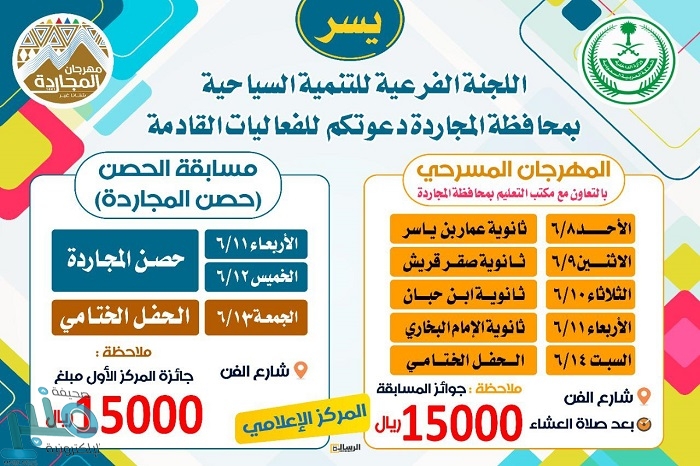 السبت ٦/١٤: الحفل الختامي للمهرجان المسرحي وإعلان صاحب المركز الأول علماً أن جميع المسرحيات ستعرض بعد صلاة العشاء بإذن الله كما أن جوائز هذه المسابقة عبارة عن مبلغ ١٥٠٠٠ريال.