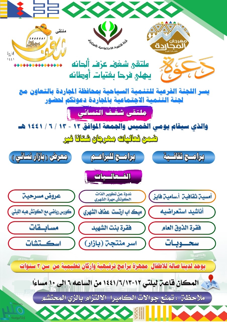 أعلنت اللجنة الفرعية للتنمية السياحية في محافظة المجاردة، بالتعاون مع لجنة التنمية الاجتماعية في المجاردة، وضمن فعاليات مهرجان المجاردة “شتانا غير” عن إقامة ملتقى شغف النسائي الأول، يومي الخميس والجمعة الموافقين ١٢ و١٣ /٦ /١٤٤١هـ، وذلك في قاعة ليلتي، من الساعة ٦ إلى الساعة ١٠ مساءً.