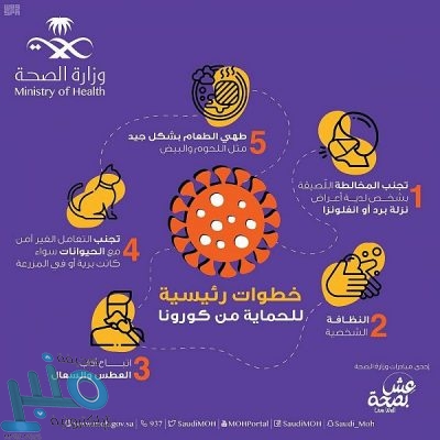 شدّدت وزارة الصحة على أهمية الالتزام بعدد من الخطوات للحماية – بإذن الله – من فيروس كورونا، حيث نشرت على صفحتها في حسابها على منصة تويتر إنفو جرافيك يبين الخطوات الخمس الرئيسة للحماية من كورونا وهي تجنب المخالطة اللصيقة بشخص لدية أعراض نزلة برد أو انفلونزا، والاهتمام بالنظافة الشخصية، وإتباع آداب العطس والسعال، مع تجنب التعامل غير الآمن مع الحيوانات سواءً كانت برية أو في المزرعة، وضرورة طهي الطعام بشكل جيد مثل اللحوم والبيض.