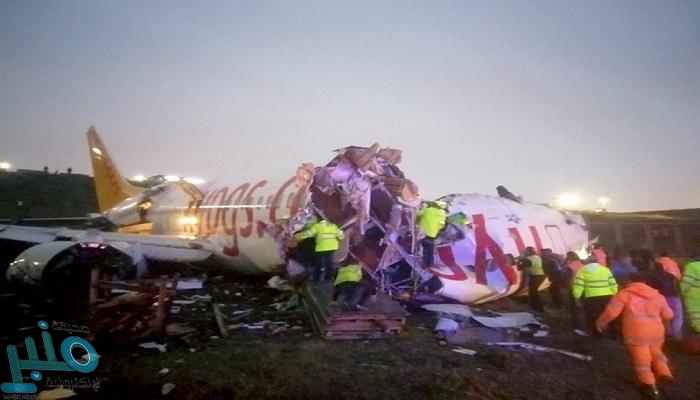 وانشطر هيكل الطائرة إلى نصفينين واشتعلت فيه النيران بعد خروج الطائرة عن المدرج في مطار صبيحة كوغشن الدولي على الضفة الاسيوية لاسطنبول، كما أظهرت مشاهد بثتها شبكة “سي إن إن تورك”.
