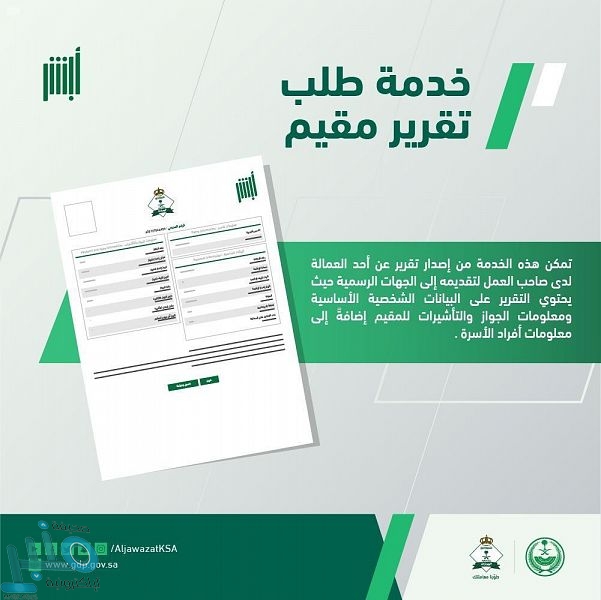 وأوضحت الجوازات أنه بإمكان صاحب العمل تنفيذ هذه الخدمة من خلال الدخول إلى منصة “أبشر”، واختيار أيقونة الخدمات الإلكترونية – خدماتي – الجوازات – ثم الانتقال إلى طلب تقرير مقيم.