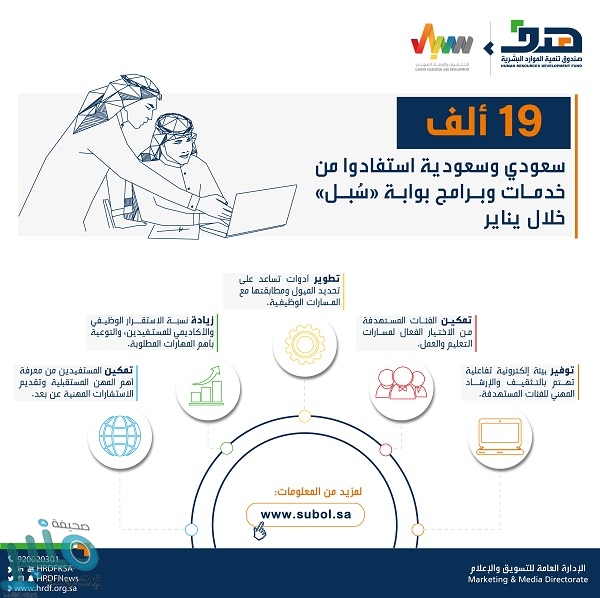 أعلن صندوق تنمية الموارد البشرية (هدف)، عن استفادة 19481سعودي وسعودية من الخدمات والبرامج التفاعلية التي تقدمها بوابة التثقيف والإرشاد المهني الإلكترونية (سُبل)، وذلك خلال شهر يناير المنصرم.