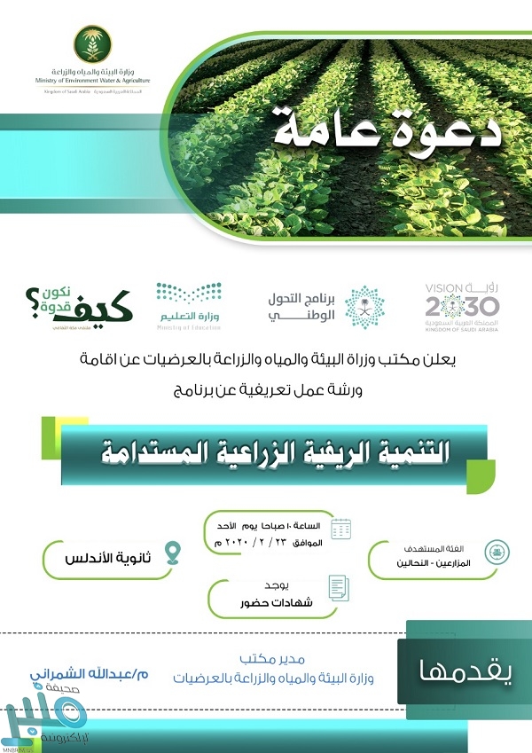 وعبر صحيفة “منبر” الإلكترونية دعا مدير مكتب وزارة البيئة والمياه والزراعة بالعرضيات المهندس عبدالله الشمراني كافة المستهدفين بالمحافظة لحضور وإثراء ورشة العمل.