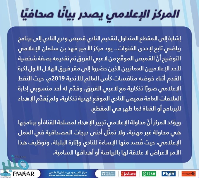 وأشار البيان إلى أن الإعلامي العُماني التقط صوراً تذكارية مع لاعبي الفريق، وقدم له أحد منسوبي إدارة العلاقات العامة قميص النادي الموقع كهدية تذكارية ولم يقدم الإهداء إلى البرنامج أو القناة كما ظهر في مقطع.