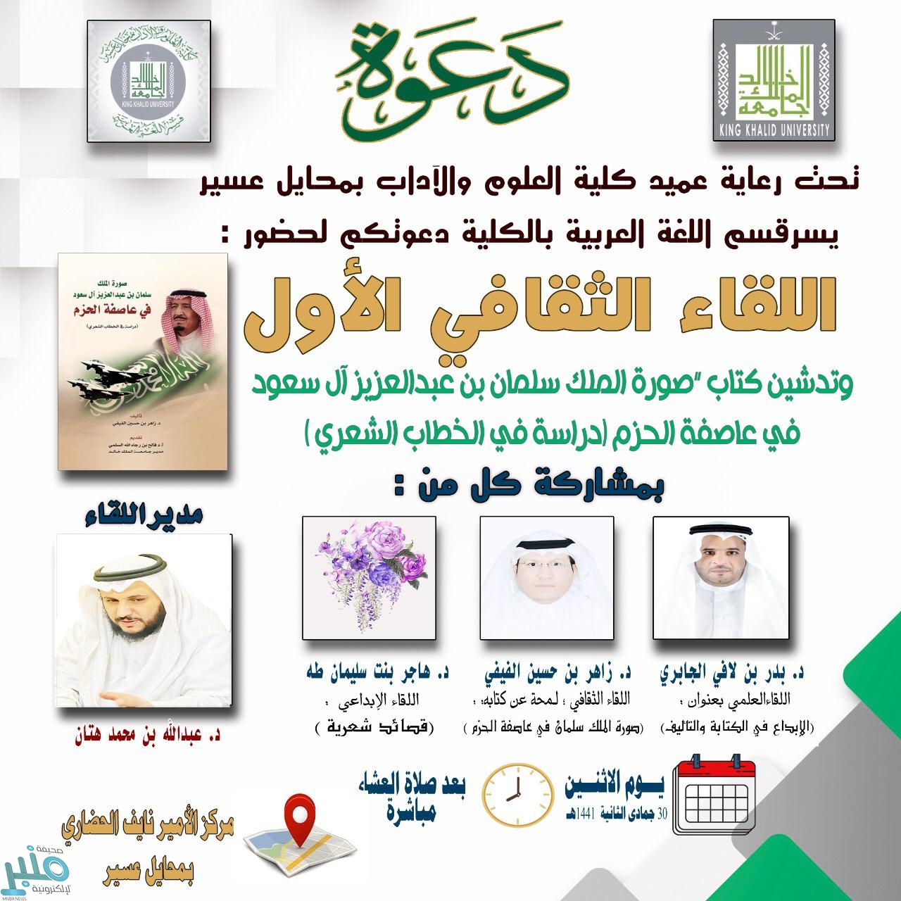 يقيم قسم اللغة العربية اللقاء الثقافي الأول، مساء يوم الإثنين الموافق ١٤٤١/٦/٣٠هـ، بعد صلاة العشاء مباشرة، في مركز الأمير نايف الحضاري بمحايل عسير، برعاية كريمة من عميد كلية العلوم والآداب الدكتور إبراهيم آل قايد عسيري.