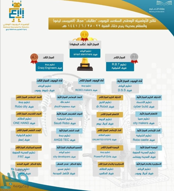حصدت الإدارة العامة للتعليم في منطقة الرياض خمسة مراكز متقدمة في الأولمبياد الوطني للروبوت “مسابقة الفيرست ليقو” على مستوى المملكة، بين 21 إدارة تعليمية، في التصفيات النهائية التي أقيمت في مدينة ينبع خلال الفترة ١٦ – ١٩ فبراير 2020