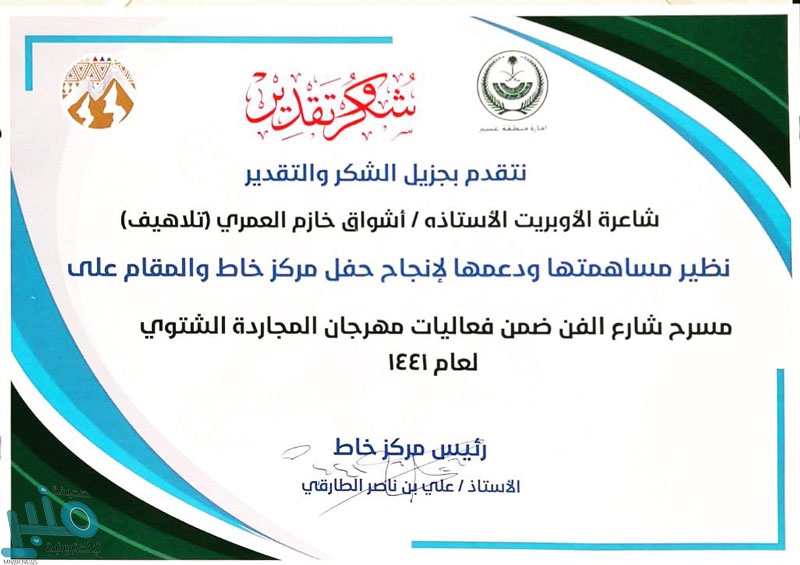 وكل الشكر والعرفان والامتنان أولاً وأخيراً لرئيس لجنة التنمية السياحية بالمجاردة سعادة المحافظ الأستاذ سعيد بن علي بن دلبوح على ما تشهده المحافظة من تطور ورُقي في كافة المجالات التعليمية والثقافية ورعايته للموهوبين والموهوبات من أبناء المحافظة.