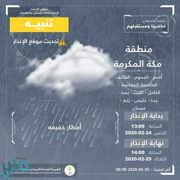 نبهت الهيئة العامة للأرصاد وحماية البيئة اليوم، من سحب رعدية مصحوبة بنشاط في الرياح السطحية، وتدني مدى الرؤية الأفقية؛ وذلك على عدد من محافظات منطقة مكة المكرمة، تشمل: (الطائف، وأضم، والعاصمة المقدسة، والجموم، والكامل، وخليص، وجدة، ورابغ، وميسان)؛ مشيرة إلى أن الحالة ستستمر حتى الساعة الـ2 من مساء اليوم.
