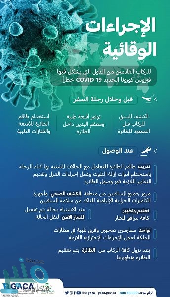 اتخذت الهيئة العامة للطيران المدني بالتعاون مع وزارة الصحة، العديد من الإجراءات الوقائية من فيروس كورونا المستجد 19-COVID)) في المنافذ الجوية للمملكة.