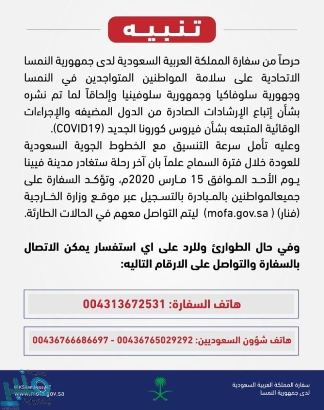 دعت سفارة المملكة في النمسا المواطنين المتواجدين في جمهورية النمسا وجمهوريتي سلوفاكيا وسوليفينا سرعة التنسيق مع الخطوط الجوية السعودية للعودة خلال فترة السماح ، علماً بأن آخر رحلة ستغادر مدينة فيينا ستكون في يوم الأحد الموافق ١٥ مارس الجاري، وذلك حرصاً من السفارةً على سلامة المواطنين وإلحاقاً لما نشر سابقاً بشأن اتباع الإرشادات الصادرة من الدول المضيفة، والإجراءات الوقائية المتبعة بشأن فيروس كورونا الجديد .