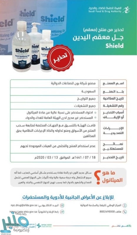 حذّرت الهيئة العامة للغذاء والدواء من مستحضر جل معقم لليدين يحمل اسم “Shield” من إنتاج مصنع شركة بون للصناعات الطبية، بسبب احتوائه على نسبة عالية من الكحول الميثيلي (ميثانول).