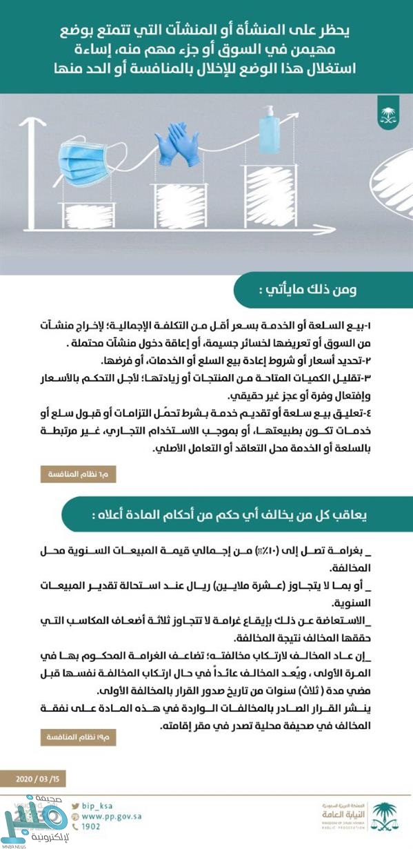 وأوضحت أن كل من يرتكب تلك المخالفات سيعرض نفسه لعقوبات تصل إلى غرامة بنحو 10% من إجمالي قيمة المبيعات السنوية محل المخالفة، أو بما لا يتجاوز عشرة ملايين ريال عند استحالة تقدير المبيعات السنوية، والاستعاضة عن ذلك بإيقاع غرامة لا تتجاوز ثلاثة أضعاف المكاسب التي حققها المخالف نتيجة المخالفة.