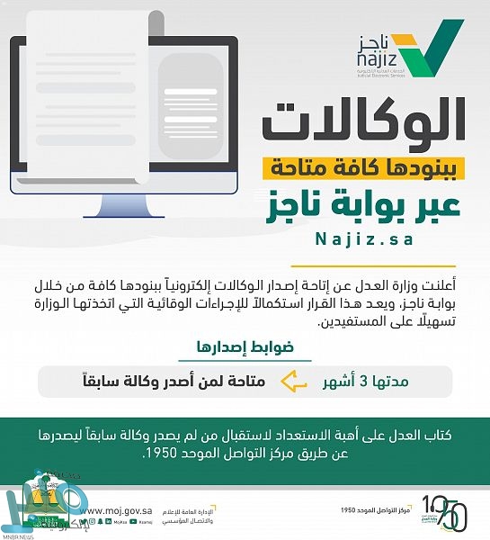 وأعلنت الوزارة أمس جاهزيتها لإصدار الوكالات بجميع أنواعها عن بُعد، من خلال بوابة ناجز najiz.sa وذلك للمستفيدين الذين أصدروا وكالات في السابق، أو من خلال الاتصال بمركز التواصل الموحد 1950 وذلك للمستفيدين الذين لم يصدروا أي وكالة في السابق.