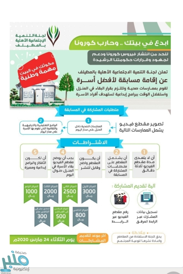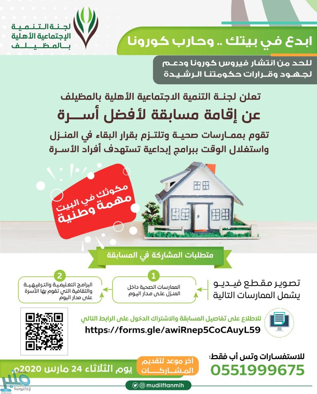 تحت شعار “أبدع في بيتك.. وحارب كورونا”، أعلنت لجنة التنمية الاجتماعية الأهلية في المظيلف بمحافظة القنفذة، اليوم الأربعاء، إقامة مسابقتها التوعوية بخطورة مرض كورونا.