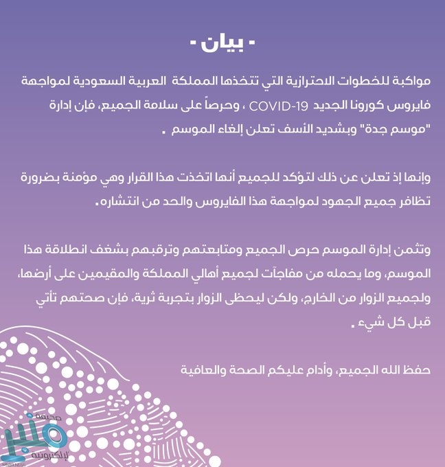 وقالت إدارة موسم جدة إنها اتخذت هذا القرار وهي مؤمنة بضرورة تضافر جهود الجميع لمواجهة الفيروس والحد من انتشاره، مثمنةً حرص الجميع ومتابعتهم وترقبهم بشغف انطلاقة الموسم وما يحمله من مفاجآت لجميع أهالي المملكة والمقيمين على أرضها ولجميع الزوار من الخارج.