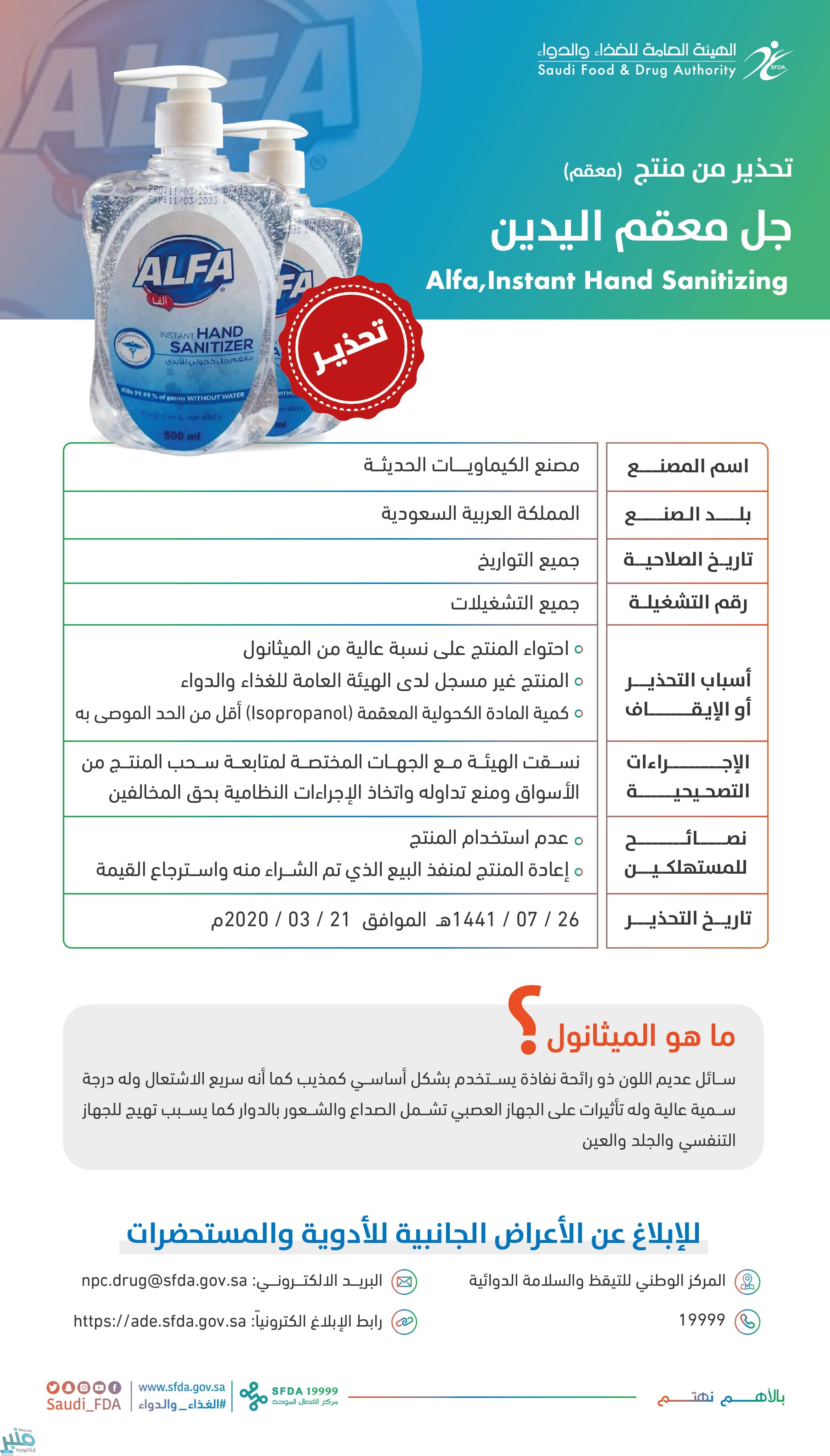 حذّرت الهيئة العامة للغذاء والدواء من جل معقم لليدين يحمل اسم “Alfa,Instant Hand Sanitizing” وينتجه مصنع الكيماويات الحديثة، بسبب احتوائه على نسبة عالية من الكحول الميثيلي (ميثانول).