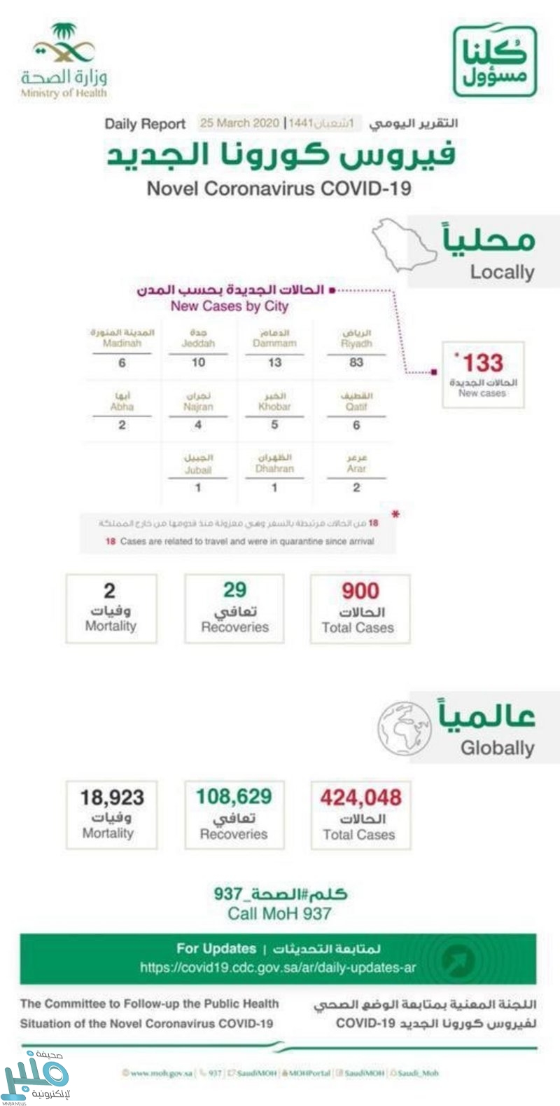 #عاجل_السعودية | المتحدث الرسمي باسم #وزارة_الصحة د. محمد العبدالعالي: إضافة 133 حالة جديدة في المملكة، ليصل إجمالي المصابين إلى 900 حالة، وحالة وفاة واحدة لمقيم في #مكة_المكرمة ليصبح إجمالي الوفيات حالتين، وإجمالي الحالات المتعافية 29 حالة.#كلنا_مسؤول. pic.twitter.com/gSpoYznDpk