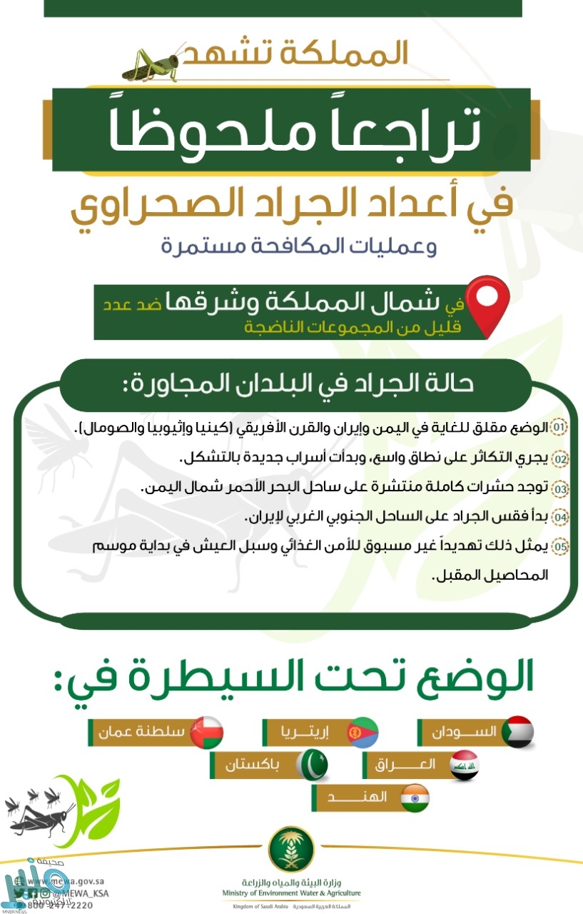وفي المقابل، أكدت الوزارة أن الوضع تحت السيطرة في كلٍّ من السودان وإريتريا وسلطنة عمان والعراق وباكستان والهند، حيث تجري عمليات مكافحة الجراد في تلك الدول باستمرار، مع ملاحظة انخفاضٍ في أعدادها هناك.