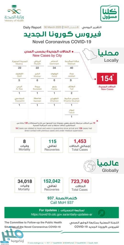 وأشار متحدث الصحة إلى “تسجيل 154 حالة جديدة مصابة بفيروس كورونا بالمملكة، وبذلك يرتفع إجمالي الحالات المصابة إلى 1453 حالة.