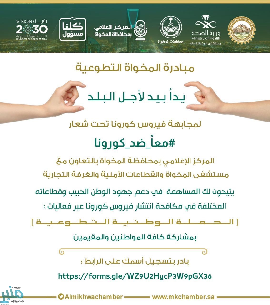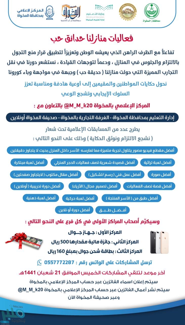 تحت رعاية وكيل إمارة الباحة المكلف أحمد بن صالح السياري، وتفاعلًا مع الظرف الراهن الذي يعيشه الوطن، وتعزيزًا لتطبيق قرار منع التجول بالالتزام والجلوس في المنازل، ودعمًا لتوجهات القيادة الحكيمة، يقيم المركز الإعلامي في محافظة المخواة، بالتعاون مع إدارة التعليم، والغرفة التجارية الصناعية، وصحيفة المخواة أونلاين، فعاليات منازلنا حدائق حب “عن بُعد”، وذلك استشعارًا لدوره في نقل التجارب المميزة التي حولت “منازلنا حدائق”، وجبهة في مواجهة وباء فيروس كورونا.