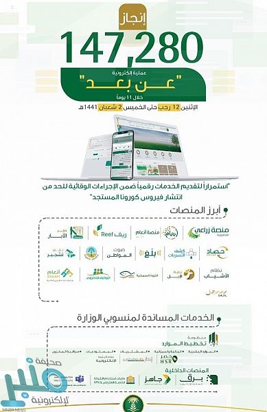 أنجزت وزارة البيئة والمياه والزراعة، نحو 147,280 عملية إلكترونية لتقديم الخدمات للمستفيدين ومنسوبي الوزارة منذ بدء تطبيق العمل “عن بعد”، خلال الفترة من الإثنين 21 رجب حتى الخميس 2 شعبان 1441هـ، وذلك استمرارًا لتقديم الخدمات رقميًا ضمن الإجراءات الوقائية التي أعلنت عنها المملكة للحد من انتشار فيروس كورونا المستجد.