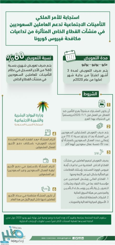 وقالت “التأمينات” على حسابها في “تويتر”، أن مدة التعويض لثلاثة أشهر هي “مايو – يونيو – يوليو”، على أن يصرف اعتباراً من بداية شهر مايو، بنسبة 60% من الأجر المسجل في نظام “ساند”.