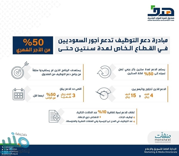 وأوضح الصندوق أن الدعم يبدأ من نسبة 30٪ وحتى 50٪ من الأجر الشهري للموظف لمدة سنتين، ويشمل من تم توظيفهم بعد بداية يوليو 2019 (بأثر رجعي)، وكذلك التوظيف الجديد والمستقبلي ، وأن يتراوح الأجر بين 4000 و 15 ألف ريال.