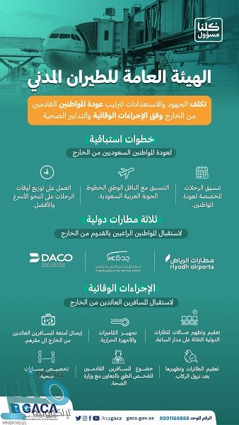 إنفاذًا لتوجيهات خادم الحرمين الشريفين الملك سلمان بن عبد العزيز آل سعود وصاحب السمو الملكي الأمير محمد بن سلمان بن عبد العزيز ولي العهد نائب رئيس مجلس الوزراء وزير الدفاع -حفظهما الله-، أكملت هيئة الطيران المدني استعداداتها واتخذت جميع التدابير والإجراءات لخدمة المواطنين المتواجدين في الخارج الراغبين في العودة للمملكة.