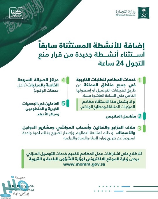 وأوضحت الوزارة أن الأنشطة الجديدة المستثناة تشمل خدمات المطاعم للطلبات الخارجية عن طريق تطبيقات التوصيل أو أسطولها الخاص، حتى الساعة العاشرة مساءً في جميع مناطق المملكة، وهذا الاستثناء لا يشمل مطاعم المركبات المتنقلة ومطابخ الولائم.
