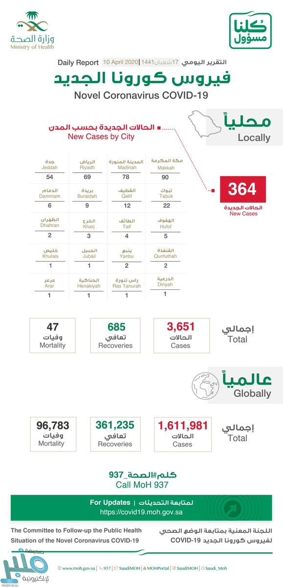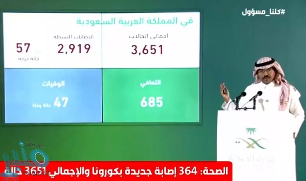 #عاجل_السعودية | المتحدث الرسمي باسم #وزارة_الصحة د. محمد العبدالعالي: تم تسجيل 364 حالة جديدة ليصل الإجمالي 3651 حالة. #كلنا_مسؤول pic.twitter.com/ak5W4bxGv8