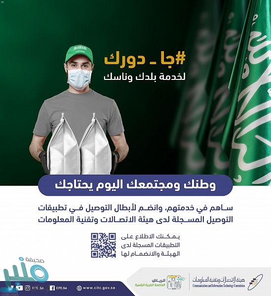 أطلقت هيئة الاتصالات وتقنية المعلومات حملة #جا_دورك ودعت فيها الراغبين من المواطنين إلى التسجيل في تطبيقات التوصيل المسجلة لديها؛ بهدف المساهمة في تلبية احتياجات المستفيدين الضرورية وإيصالها إلى منازلهم.