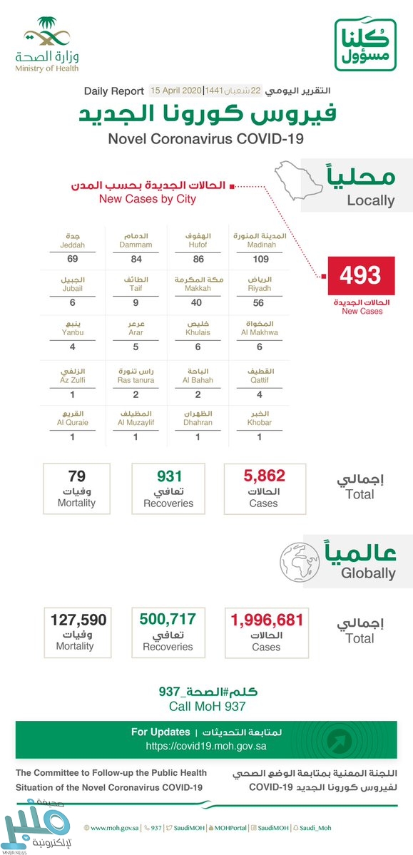 وأشار “متحدث الصحة”، إلى تسجيل 6 حالات وفاة جديدة بـ”كورونا” لتصل الوفيات إلى 79 حالات، وتعافي 42 حالة جديدة، ليصل الإجمالي في المملكة إلى 931 حالة.